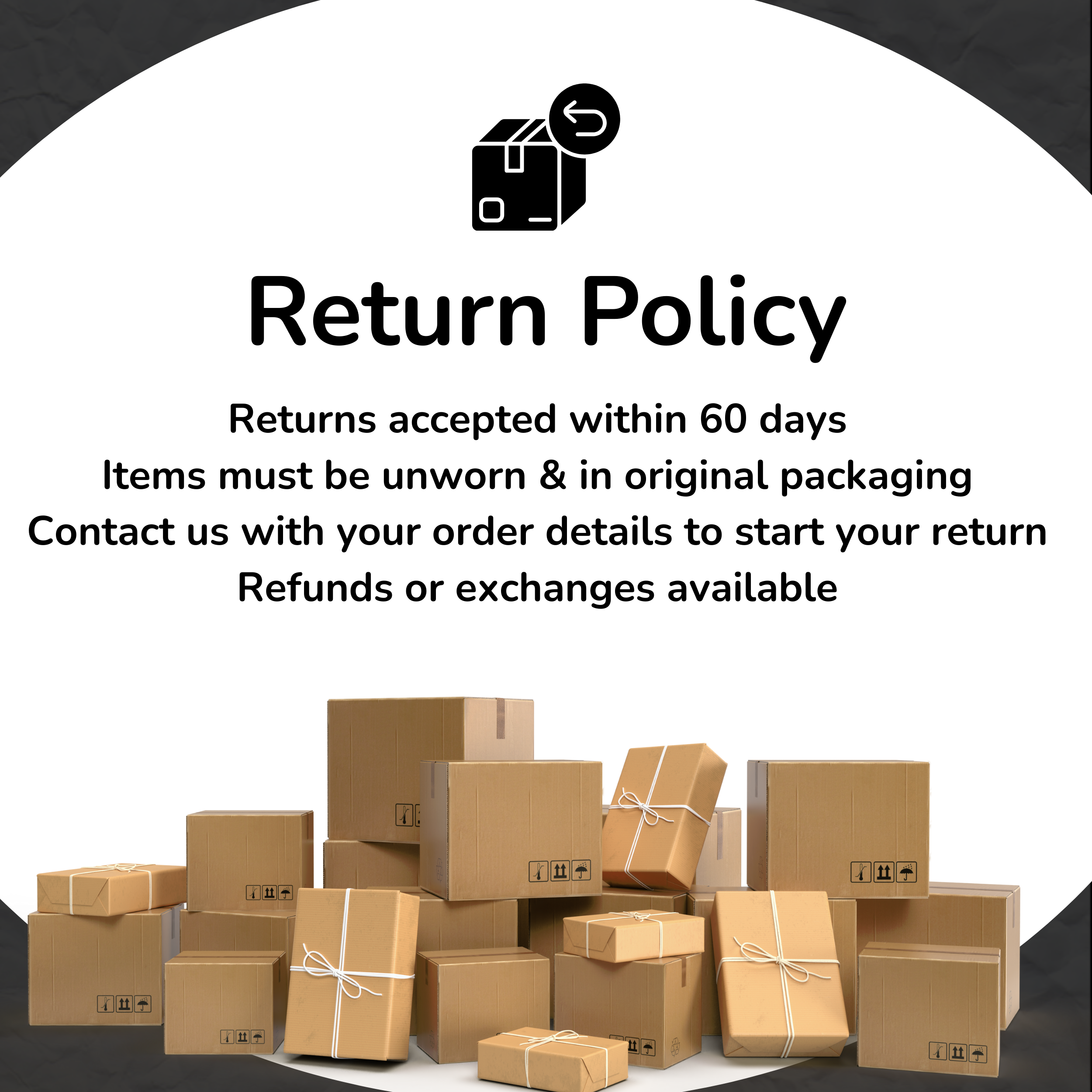 Returned items must be in original condition, unworn, and include all original packaging to qualify for a refund or exchange.